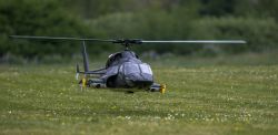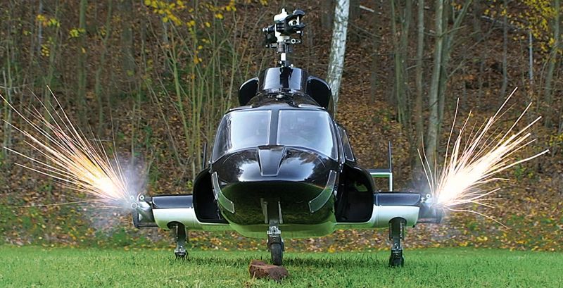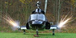 The biggest Airwolf from VARIO is a 1050 size scale helicopter. You can power this remote-controlled model helicopter with turbine or electric propulsion. The film helicopter (Bell 222 with lateral fuselage widening) is an invention of Universal Television and Belisarius Productions. The myth of legendary performance potential surrounds him as much as the legends of his film history. Everyone secretly dreams of spectacular flights with an AIRWOLF. There are no limits to your imagination when building this model! The model incorporates GRP technology which substantially shortens the required building time. The 2.5 l fueltank - itself a GRP moulding - doubles up as a support for the undercarriage. The retractable undercarriage is mounted on the transverse member below the tank. The supports in the fuselage for the mechanical system are also based on a GRP sub-structure.