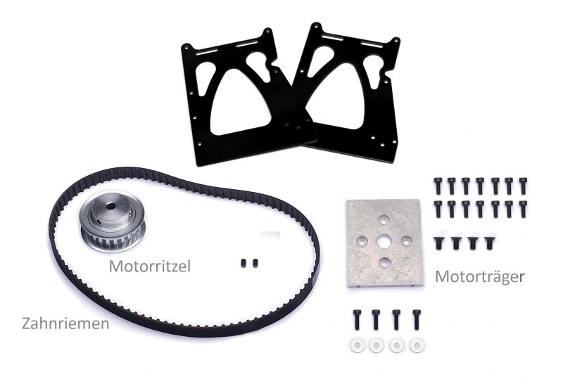 Supplied with the drive set are: motor mount, pulley (26 teeth), belt, fixings