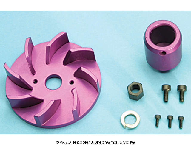 Compared to the version in GRP the aluminium turbo-fan offers the advantages of being perfectly balanced and produces more cooling air. The extra weight of the fan gives a greater flywheel effect so allowing superior adjustment of the engines idle speed.